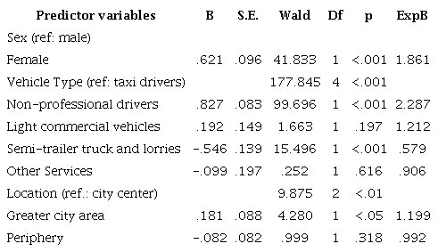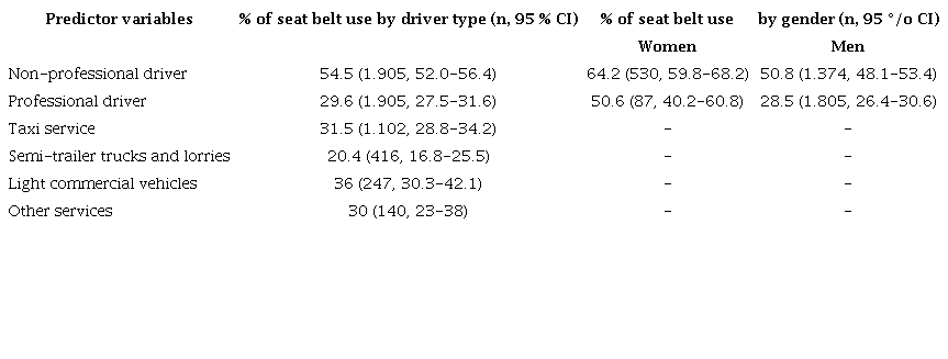 A total of 3.810 drivers were registered (1.905 professional and 1.905 non-professional). Among professionals, 57.8 % were taxi drivers, 21.8 % were semi-trailer trucks and lorry drivers, 13 % were light commercial vehicle drivers, and 7.4 % were drivers of other services. The overall seat belt use rate was 42 % (95 % CI: 40, 43). Table 1 details the prevalence of seat belt use for professional and non-professional drivers by gender and type of vehicle. Table 2 shows the results of the logistic regression. The logistic regression indicated that taxi drivers use seat belts less often than non-professional drivers but more often than semi-trailer truck and lorry drivers. Differences between taxi drivers and other categories of professional drivers were not statistically significant. A lower seat belt use rate was also observed among males, and seat belt use was slightly lower in the city center compared to the greater city area (Table 2).