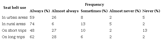 Table 3 shows the frequency of seat belt use under varying conditions. Less frequent seat belt use was observed in the city (compared to rural areas) and on short trips compared to long ones.