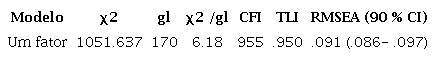 Os resultados relacionados à análise fatorial confirmatória apontaram para índices de ajustes razoáveis. Cabe destacar que o CFI e o TLI estão adequados conforme as orientações da literatura (Muthén & Muthén, 2017; Tabachnick & Fidell, 2019). Por sua vez, os índices relacionados ao χ2 /gl e ao RMSEA mostraram-se limítrofes e acima das indicações da literatura. Aponta-se ainda que o χ2 foi significativo (p = < .01). A Tabela 1 apresenta o detalhamento dos resultados desta análise. Em seguida, foram observadas as cargas fatoriais dos itens. As cargas variaram entre .40 e .87. Não foram observadas cargas inferiores a .30, ou mesmo, cargas negativas. Por sua vez, os índices de confiabilidade observados mostraram-se superiores a .90, o que indica boa consistência dessa solução fatorial. A Tabela 2 apresenta as cargas fatoriais dos itens da escala, bem como os indicadores de confiabilidade.