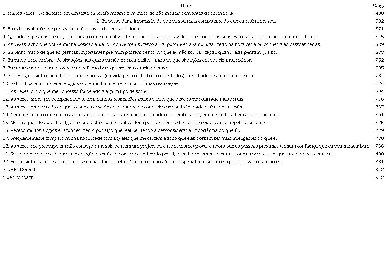Clance Impostor Phenomenon Scale. Utilizou-se a versão traduzida e adaptada para o contexto brasileiro da ECFI (Bezerra et al., 2021). A escala é composta de 20 itens que devem ser respondidos em uma escala Likert que varia entre 1 (“não me descreve”) e 5 (“descreve-me totalmente”). No estudo da adaptação brasileira, encontrou-se uma estrutura unifatorial que explicou entre 46.3 % (Estudo 1) e 57 % (Estudo 2) da variância total, e boa consistência interna (alfa de Cronbach acima de .90). A correção se dá por meio do somatório dos itens em que quanto maior a pontuação do respondente maior a manifestação do FI.