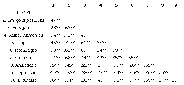Em seguida, foram observados os resultados referentes à relação entre as variáveis selecionadas para este estudo. Os dados obtidos pela medida de FI apresentaram coeficientes de correlação significativos com todas as demais variáveis (Tabela 3). Foram negativas as relações entre FI e medidas de bem-estar e de autoestima, os coeficientes de correlação variaram entre - .28 e - .71. Por sua vez, foram positivas as correlações entre FI e variáveis de adoecimento (Kessler K-10), que variaram entre .55 e .66. Destaca-se ainda que outras correlações significativas foram observadas na relação entre as demais variáveis.