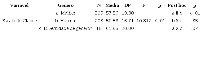 Em seguida, buscou-se compreender se haveria diferenças na variância das médias entre os agrupamentos de gênero (Tabela 4). Do ponto de vista dos dados descritivos, observou-se que a média geral dos participantes (n = 620) foi 55.36 (DP = 18.79). A partir das informações indicadas no questionário sociodemográfico, realizaram-se três agrupamentos: mulheres cisgênero (n = 396), homens cisgênero (n = 206) e diversidade de gênero (n = 18). Esse agrupamento foi realizado buscando favorecer o potencial das análises de variância. Após isso, observou-se que o grupo que apresentou médias mais elevadas em comparação aos demais foi o de diversidade de gênero, seguido pelo grupo de mulheres. A análise da variância indicou a presença de diferenças significativas na comparação dos grupos. A análise de post hoc apontou para diferença significativa na comparação entre o grupo mulheres cisgênero e homens cisgênero. Maiores informações são apresentadas na Tabela 4.