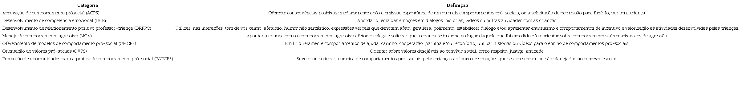Formulário de registro de evento elaborado pelas pesquisadoras, com base na literatura que descreve práticas docentes promotoras de comportamentos pró-sociais (Bergin, 2018). O instrumento contempla espaço para o registro de antecedentes, respostas e consequentes, bem como para anotações adicionais e para a categorização das práticas observadas. As categorias previamente estabelecidas, bem como suas siglas e definições, são apresentadas na Tabela 1.