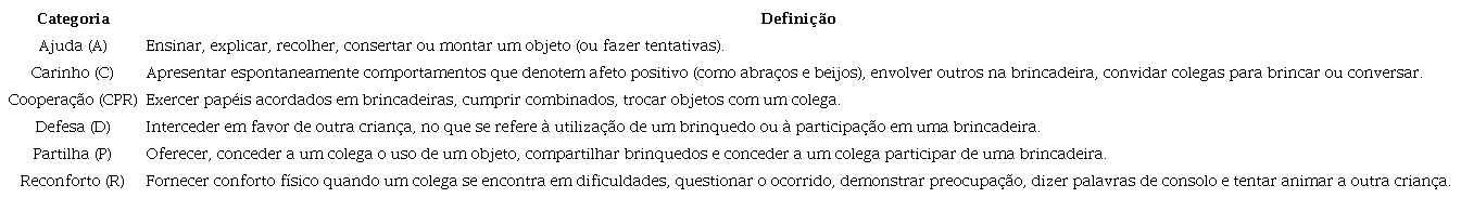 Formulário de registro de evento elaborado pelas pesquisadoras, com base na literatura que descreve e categoriza comportamentos pró-sociais entre pré-escolares (Ramaswamy & Bergin, 2009). O instrumento contempla espaço para o registro de antecedentes, respostas e consequentes, bem como para anotações adicionais e para a categorização dos comportamentos observados. As categorias comportamentais predefinidas foram ajudar, compartilhar, cooperar, manifestar afeto e reconfortar. A categoria “defender” passou a compor o formulário após a realização do estudo-piloto, que será referido posteriormente. As categorias, bem como suas siglas e definições, são apresentadas na Tabela 2.