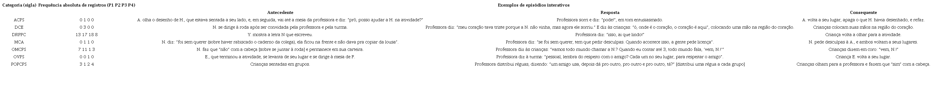 As práticas potencialmente promotoras de comportamentos pró-sociais nas interações com as crianças foram apresentadas pelas quatro professoras, somando-se 95 ao todo, e organizadas em sete categorias. A categoria ACPS envolveu a aprovação da professora à solicitação de uma criança para ajudar um colega; DCE abarcou diálogos sobre estados emocionais, demonstrando como as atitudes de uns podem afetar o modo como outros indivíduos se sentem; e DRPPC abrangeu comportamentos de valorizar atividades desenvolvidas, incentivar a autonomia e utilizar tom de voz calmo e expressões que denotavam afeto nas interações com as crianças. Por sua vez, MCA incluiu orientar a criança sobre um comportamento alternativo ao agressivo dirigido antes a um de seus pares; OMCPS compreendeu oferecer modelo às crianças com relação aos comportamentos de ajuda, partilha e reconforto; OVPS abrangeu a orientação às crianças sobre o respeito ao colega que ainda não havia finalizado uma tarefa; e POPCPS envolveu, sobretudo, instruir as crianças a compartilharem materiais. A Tabela 3 apresenta as categorias, a frequência absoluta de registros e exemplos de episódios interativos, envolvendo práticas potencialmente promotoras de comportamentos pró-sociais das professoras, contempladas na coluna “Resposta”. Para preservar o sigilo, foram apresentadas apenas as iniciais dos nomes das crianças.