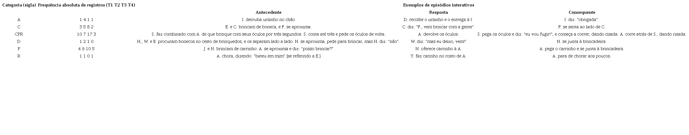 Comportamentos pró-sociais nas interações entre crianças foram registrados nas quatro turmas, somando-se 97 ao todo, organizados em sete categorias. Destaca-se que a categoria A envolveu, principalmente, comportamentos de atender a necessidades de suporte de um colega, no que se referia à montagem ou ao conserto de um brinquedo; C compreendeu abraçar outra criança espontaneamente ou convidar para brincar; e D incluiu interceder em favor de um colega que não havia sido autorizado por outra criança a participar de uma brincadeira. Por sua vez, CPR envolveu trocar brinquedos com outra criança, cumprir combinados, bem como estabelecer parcerias em brincadeiras que envolviam a reunião de peças de encaixe; P abrangeu, principalmente, oferecer um brinquedo e conceder a um colega seu uso; e R englobou comportamentos direcionados a crianças que se encontravam chorando, como fazer carinho no rosto do colega ou dizer palavras de consolo. A Tabela 4 apresenta categorias, frequência absoluta de registros e exemplos de episódios interativos que envolvem a emissão de comportamentos pró-sociais pelas crianças, os quais são contemplados na coluna “Resposta”. Para preservar o sigilo, foram apresentadas apenas as iniciais dos nomes das crianças.