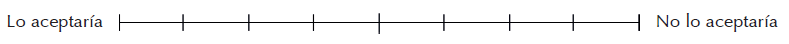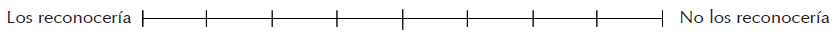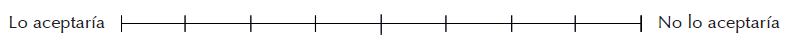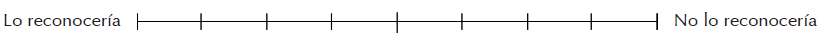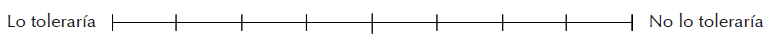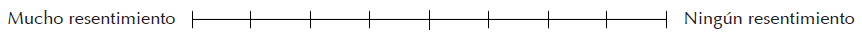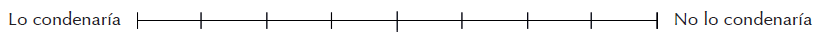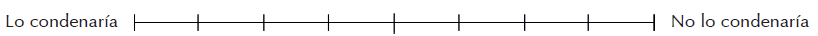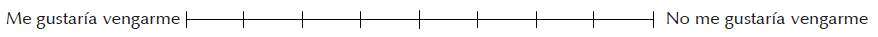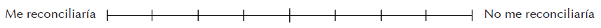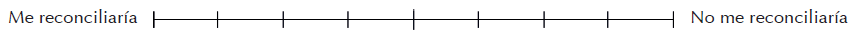 Por otra parte, se diseñó un cuestionario sobre el perdón para recoger actitudes explícitas, que consistió en 24 oraciones seguidas de una escala con dos opciones de respuesta. Estas opciones se ofrecían en los extremos de una línea con subdivisiones, para que la persona eligiera la ubicación de su actitud en dicha escala, con la que se sintiera más identificado (ver anexo 2). Este cuestionario fue construido por el grupo investigador, con base en la teoría revisada sobre el perdón, sus conceptos afines y la relación que existe con el contexto colombiano (Alzate et al., 2009), e investigaciones previas del perdón desde las actitudes explícitas, en las cuales se ha indagado por medio de este tipo de instrumentos sobre las conceptualizaciones y las actitudes hacia el perdón (Cortés et al., 2015), buscando que cada afirmación estuviera relacionada con cada una de las palabras estímulo del IAT. Los ítems se construyeron con las mismas palabras seleccionadas para la prueba IAT, divididas en los grupos de guerrilla - perdón - no perdón y paramilitares - perdón - no perdón. Un ejemplo de este tipo de ítems se ofrece en la figura 2: