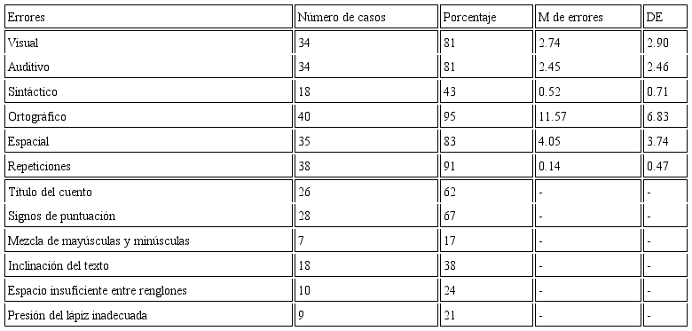 Los errores que predominaron en las dificultades de procesamiento visual fueron las omisiones, y en las dificultades de procesamiento fonológico, las sustituciones. Los errores ortográficos consistieron en la ausencia de acentos y uso incorrecto de mayúsculas; las dificultades espaciales de mayor frecuencia fueron las uniones de palabras. Presentaron, además, alta frecuencia de dificultades sintácticas.