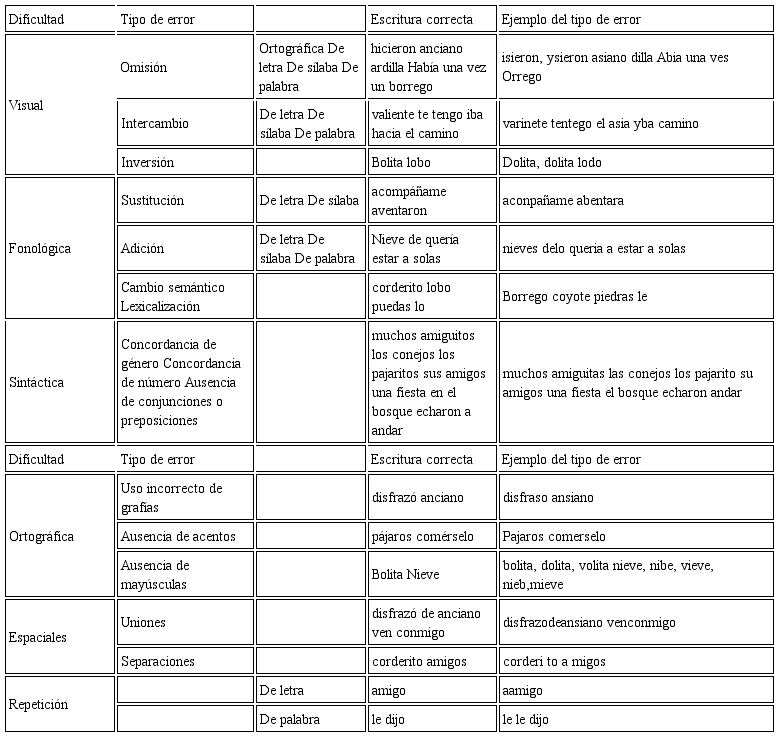 Por otra parte, se analizaron los errores de escritura de tipo: (a) visual, como omisiones, inversiones, intercambios; (b) fonológicos, como sustituciones, adiciones, cambios semánticos, lexicalizaciones; (c) sintácticos, tales como dificultades de concordancia entre género y número, ausencia de conjunciones o preposiciones; (d) ortográficos, como uso incorrecto de grafías, ausencia de acentos y mayúsculas; (e) espaciales, tales como ausencia de uniones o separaciones entre letras y renglones; y (f) repeticiones de letras, sílabas o palabras.