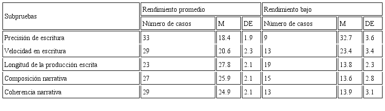 En los 42 niños evaluados se observó un rendimiento promedio en el mayor número de casos para todas las subpruebas de escritura aplicadas. Ahora bien, se dividió la muestra en dos grandes grupos, los niños que presentaron un desempeño promedio y aquellos con un rendimiento bajo, según la propia clasificación que sugiere la calificación de la batería ENI. Para mayores detalles, se ofrece la tabla 3.