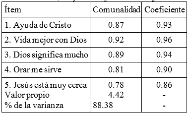 Igualmente, se estimó el coeficiente de adecuación de la muestra de Kaiser-Meyer-Olkin (KMO), que es una prueba más conservadora que la prueba de Bartlett y es aceptable si el valor es mayor a 0.70 (Kaiser, 1974). Por último, se observaron las comunalidades y los coeficientes en la matriz de factores.