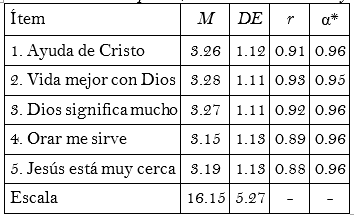 La escala breve de Francis-5 se compone de cinco ítems que exploran la actitud hacia al cristianismo en relación con Dios, Jesús y la oración. Estos incisos presentan un patrón de respuesta politómico ordinal con cinco opciones de respuesta, desde muy en desacuerdo hasta muy de acuerdo, que se califican de 0 a 4. En Colombia, Francis-5 mostró un adecuado desempeño psicométrico en estudiantes adolescentes (α = 0.74 y un ϖ = 0.75). La validación test-retest, calculada con el coeficiente de correlación de Pearson y de correlación intraclase, fue de 0.69 (Campo-Arias et al., 2009; Miranda-Tapia et al., 2010).