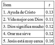Por otro lado, la consistencia interna de Francis-5 fue alta, ya que alcanzó valores alfa de Cronbach y omega de McDonald superiores a 0.95. Esta observación es consistente con los valores reportados en universitarios colombianos, en el estudio de Ceballos et al. (2015). No obstante, estos valores son superiores a los observados en investigaciones colombianas con estudiantes adolescentes, en las que se encontraron valores entre 0.71 y 0.91 (Campo-Arias et al., 2009; Ceballos et al., 2015; Cogollo et al., 2012; Miranda-Tapia et al., 2010). Estos valores son excelentes para una escala con un número tan reducido de ítems (Tavakol y Dennick, 2011); sin embargo, se debe tener precaución en su interpretación, pues es posible la presencia de un ítem redundante o duplicado (Keszei et al., 2010). Estudios posteriores requerirían aplicar análisis factorial confirmatorio para corroborar esta observación (Campo-Arias et al., 2012; Kahn, 2006).