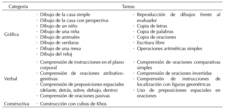 Los instrumentos utilizados en la presente investigación permitieron detallar el estado funcional de los mecanismos neuropsicológicos propuestos, en particular el de análisis y síntesis espacial, de interés para esta investigación. Los instrumentos están fundamentados en la teoría y metodología psicológica y neuropsicológica de Vigotsky (1995) y Luria (1986). Estos son: la Evaluación Neuropsicológica Infantil Breve (Solovieva y Quintanar, 2013), la Evaluación Neuropsicológica de la Integración Espacial (Solovieva y Quintanar, 2012a) y la Evaluación Neuropsicológica del Éxito Escolar (Solovieva y Quintanar, 2012b). En la tabla 2 se presentan las tareas espaciales seleccionadas de dichos protocolos, las cuales fueron sistematizadas en tres categorías: gráfica, verbal y constructiva.