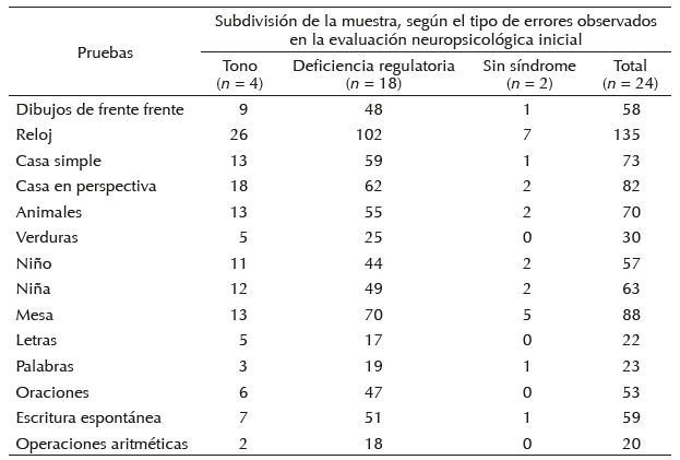 La evaluación neuropsicológica realizada a cada niño de la muestra se revisó para identificar los mecanismos comprometidos en su perfil cognitivo. Esta revisión permitió organizar a los participantes en tres grupos, según el tipo de errores presentados en la evaluación neuropsicológica: (a) tono de activación cerebral deficiente (n = 4), en el que se destacan los fallos en el tono de activación cerebral puro, o en combinación con fallos en el mecanismo de análisis y síntesis espacial; (b) deficiencia regulatoria (n = 18), caracterizado por fallos en el mecanismo de regulación y control de la actividad puro o en combinación con dificultades en el tono de activación del trabajo cerebral, la organización secuencial motora, el análisis y síntesis espacial y la integración cinestésica; y (c) ausencia de síndrome neuropsicológico (n = 2) (tabla 1).