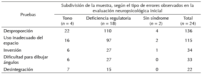En las tareas gráficas se identificaron cinco tipos de errores espaciales: (a) desproporción, (b) uso inadecuado del espacio, (c) inversión, (d) dificultad para dibujar ángulos, y (e) desintegración. En la tabla 4 se presenta su frecuencia, de mayor a menor.