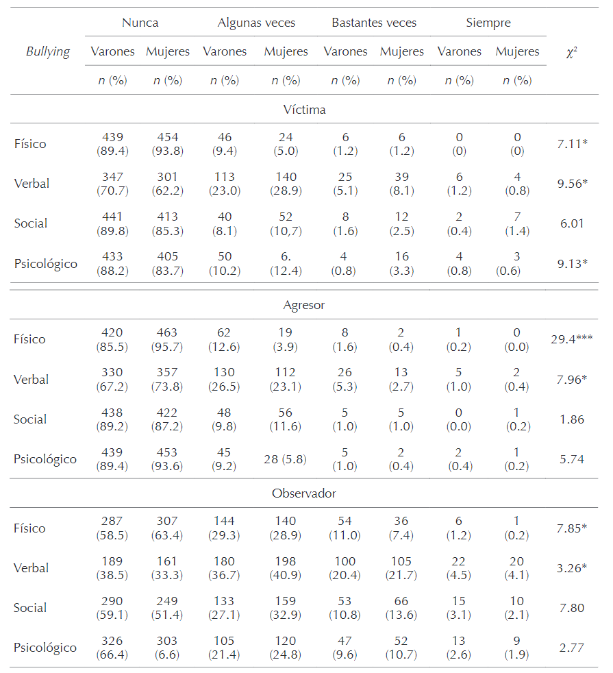 Con la finalidad de dar respuesta al segundo objetivo del estudio ‒identificar específicamente la prevalencia de las conductas de bullying en función del sexo‒, se realizaron análisis de contingencias comparando los porcentajes de varones y mujeres que indicaban nunca haber sufrido, ejercido u observado ninguna de estas conductas, frente a los que reconocían haber participado en los tres roles en una o más ocasiones (tabla 1).