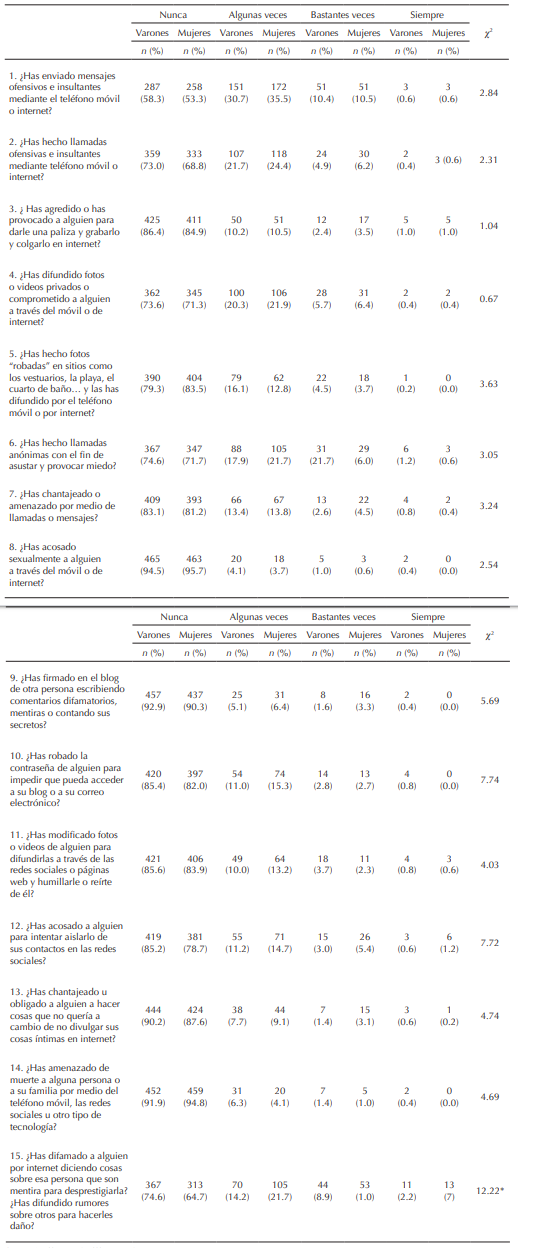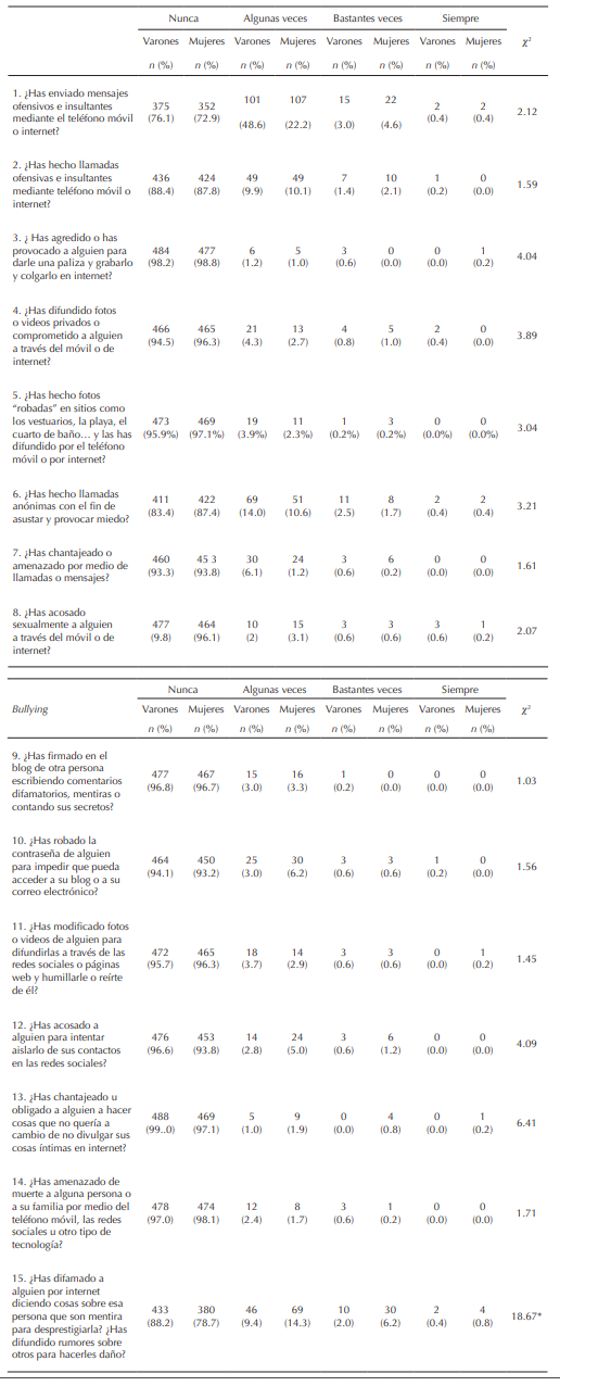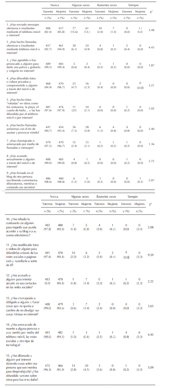 En cuanto al cyberbullying: (a) el 40.9 % de los estudiantes dijeron haber sido cibervíctimas, el 46.5 % eran varones, mientras que el 53.5 % eran mujeres; la diferencia resultó no ser significativa (.² = 15.38, . > 0.050); (b) el 22.8 % afirmaron realizar una o más conductas de ciberagresión, el 52.9 % eran varones y el 47.1 % eran mujeres; no resultó significativo el análisis de contingencias (.² = 17.79, . > 0.050); (c) el 60.5 % mencionaron haber sido observadores de este tipo de conductas en una o más ocasiones; de ellos, el 47.6 % eran varones y el 52.4 %, mujeres, siendo no significativa la diferencia (.² = 25.23, . > 0.050); y (d) el 18 % de personas mencionaron haber sufrido y realizado alguna de estas conductas; el 52.8 % de las víctimas agresivas eran varones y el 47.2 %, mujeres; esta diferencia no fue significativa (.² = 16.82, . > 0.050).