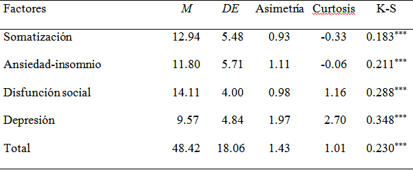 Sobre sus propiedades psicométricas, se encuentra que tiene una estructura factorial adecuada de cuatro dimensiones que explican el 50.2% de la varianza (Shayan et al., 2015). Asimismo, guarda una elevada consistencia interna entre universitarios con α = 0.87 en la escala global (Poorolajal et al., 2017), y presenta validez predictiva para identificación de casos psiquiátricos (Vergara-Moragues y González-Saiz, 2020). En el presente estudio, la consistencia interna del test encontrado en estudiantes ecuatorianos fue de α = 0.92 para somatización, α = 0.96 para ansiedad-insomnio, α = 0.95 para disfunción social y α = 0.98 para depresión severa.