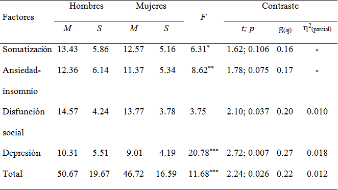 Se presentaron diferencias estadísticamente significativas en los factores de disfunción social y depresión. En estos dos casos, los hombres mostraron mayor presencia de estos indicadores que las mujeres, así como en la valoración global de la salud general de la prueba. En lo que respecta a los componentes de somatización y ansiedad-insomnio, la condición del género fue invariante (tabla 2).