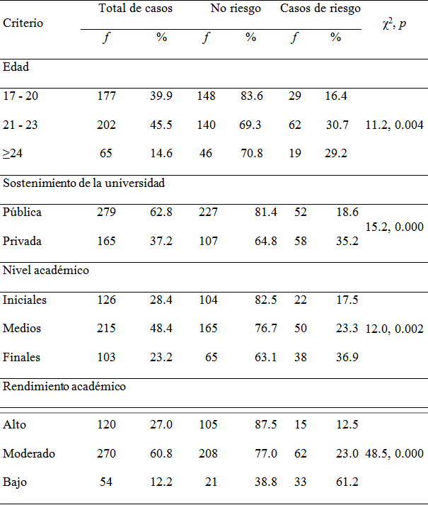 En cuanto a la identificación de casos probables de alteraciones mentales significativas, el 24.7% de los participantes reportaron una percepción de malestar en la salud en general. Siendo necesario en estos casos un proceso de evaluación más profundo y especializado. Con respecto a la prevalencia de casos considerando factores socioacadémicos, la tabla 3 muestra que se encontraron diferencias significativas (p < 0.05) en aspectos como la edad (mayores casos en estudiantes entre 21 y 23 años), el tipo de sostenimiento económico de la universidad de procedencia (universidad privada), el nivel académico que se cursa (niveles superiores como 7°, 8° y 9° nivel) y el rendimiento académico (más casos en participantes de bajo rendimiento).