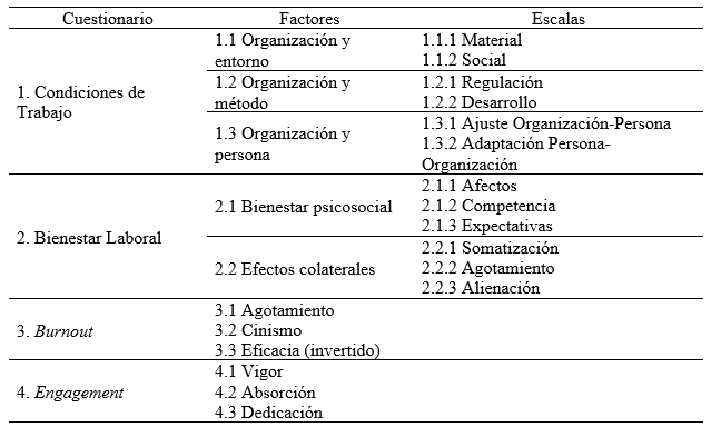 Para la recolección de la información, se utilizó la técnica de encuesta mediante un cuestionario de aplicación grupal y respuesta individual. La batería incluyó un conjunto de instrumentos estandarizados y reiteradamente validados en diversos países latinoamericanos: el cuestionario de Condiciones de Trabajo (Ansoleaga et al., 2011; Blanch et al., 2010a; Granero et al., 2018; Ochoa y Coello-Montecel, 2020) y el cuestionario de Bienestar Laboral General (Ansoleaga et al., 2011; Blanch et al., 2010b; Goulart et al., 2012; Granero et al., 2018; Ochoa y Blanch, 2016; Sulbarán y Parra, 2016). Para la medida del burnout, se aplicó el MBI, GS (Maslach Burnout Inventory, General Survey) en la versión española del Instituto Nacional de Seguridad e Higiene en el Trabajo (2007), y para el de Engagement se usó el UWES (Ultrecht Work Engagement Scale), de Schaufeli y Bakker (2004), en la versión en español de Salanova y Schaufeli (2009). La herramienta incluyó, además, algunos ítems cerrados referidos a datos demográficos y a significados y valores personales, laborales y profesionales, así como algunas preguntas abiertas sobre significados del propio trabajo y sobre lo mejor y lo peor del mismo (Tabla 1).