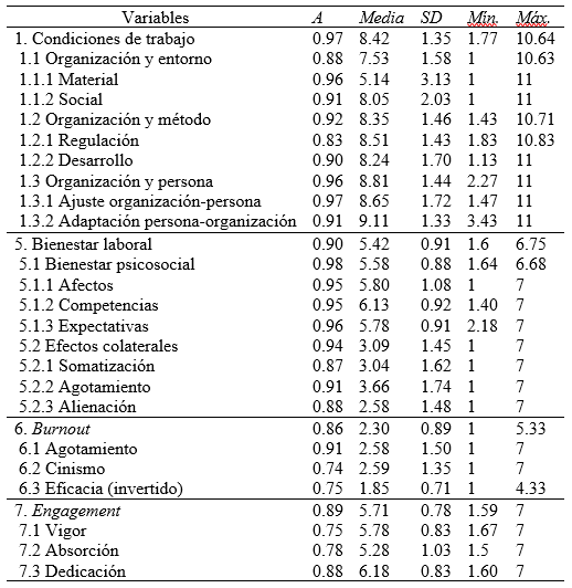 El “bienestar laboral” general percibido obtuvo una puntuación globalmente positiva (M = 5.42; DT = 0.91), bastante superior al valor 4, que indica la equidistancia entre el polo malestar (valor 1) y el de bienestar (valor 7) en la escala construida en formato de diferencial semántico. El primer factor que integra esta variable es el “bienestar psicosocial” (M = 5.58; DT = 0.88). Los participantes declararon experimentar en su trabajo afectos más cercanos a satisfacción, seguridad, bienestar, certidumbre y confianza que a sus contrarios. Un sector minoritario del personal profesional y administrativo fue algo pesimista sobre las tendencias percibidas de cambio, en aspectos como la calidad de vida, la conciliación del trabajo con la vida privada y especialmente sobre la cordialidad en el trabajo.