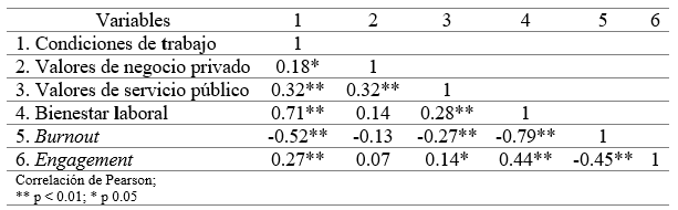 En la tabla 3 destacan tres índices de correlación significativamente altos del bienestar laboral con el burnout (r = -0.79, p <0.01,), con las condiciones de trabajo (r = 0.71, p < 0.01) y con el engagement (r = 0.44, p < 0.01). Las puntuaciones en bienestar laboral se relacionan positivamente con las de las condiciones de trabajo y el engagement y, como era teóricamente esperable, negativamente con las de burnout. Asimismo, el engagement aparece asociado negativamente con el burnout (r = -0.45, p < 0.01).