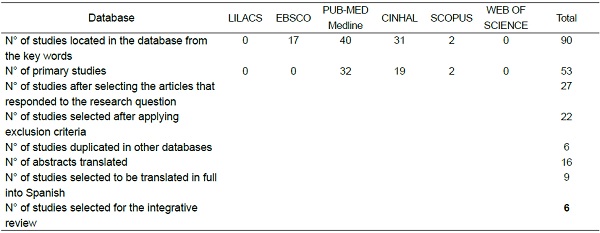The various stages of the search were reviewed by a librarian and the research question was the basis on which studies were selected for this integrative review. Table 1 shows a summary of the selection of the primary data in the databases.
