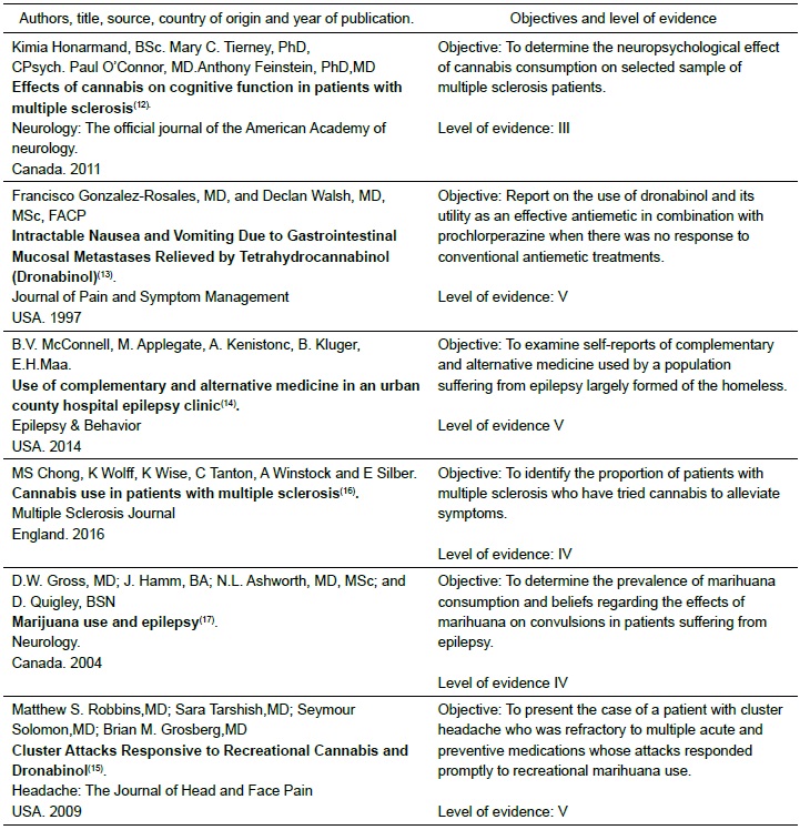 The data are presented below. All of the articles selected originated in medical research, allowing Nursing professionals to increase knowledge on the therapeutic Marihuana use that can lead to a discussion on the involvement of Nursing in therapeutic use of this product.