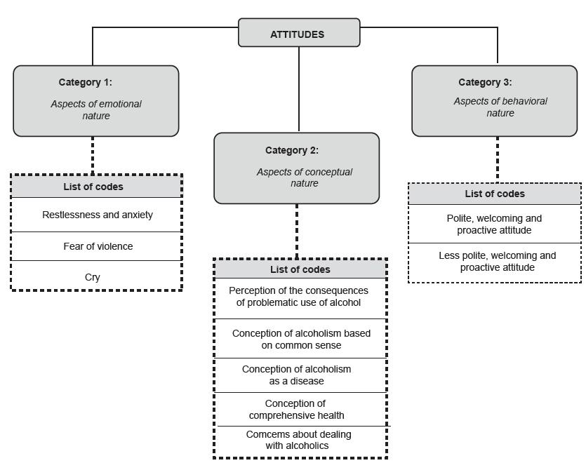 With regard to qualitative data, three categories were identified in relation to the students’ attitudes towards alcoholic people. They addressed emotional, conceptual and behavioral aspects, namely: