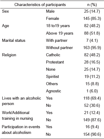 The average age of the students was 20.1 years (SD = 3.5), the majority was female (145, 85.3%), non-Catholic (protestant, spiritist, agnostic, others, or without religion) or non-religious (88; 51.85%); and had no partner (163; 95.9%). Current or previous socialization with alcoholic people was reported by 118 (69.4%) students. As for professional aspects, most reported having no job, or additional training in the health area (149, 87.6%) or participation of events on alcoholism (154; 90.6%) (Table 1).