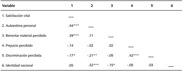 En la Tabla 1 se aprecian los estadísticos descriptivos. Como se observa, los participantes registraron altos niveles de autoestima e identidad nacional colombiana. Por su parte, el bienestar material percibido y la satisfacción vital presentaron niveles medio-altos. Las medias más bajas correspondieron al prejuicio grupal percibido y a la discriminación personal percibida; en especial, esta última presentó una puntuación media muy por debajo del punto de neutralidad. Dicho resultado sugiere que, en conjunto, los participantes se han sentido poco rechazados en los Estados Unidos, debido a su origen.
