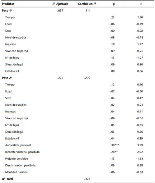 En el segundo paso, se incluyeron en el modelo además de las sociodemográficas, las variables psicosociales independientes. La varianza explicada por estas, casi dobla la varianza explicada por las variables sociodemográficas. Dos variables psicosociales emergieron como predictoras positivas de la satisfacción vital: la autoestima personal y el bienestar material percibido. Dicho resultado es congruente con el segundo supuesto de la hipótesis 1 y referido a la prueba de regresión. La identidad nacional colombiana, el prejuicio grupal percibido y la discriminación personal percibida, en cambio, no mostraron tener impacto sobre la satisfacción vital. Al igual que en el paso 1, no hubo variables sociodemográficas que pudiesen predecir la satisfacción vital.