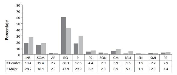 La prevalencia de los trastornos de sueño más frecuentes encontrados a través del ctsm fueron: ronquido (50%), indicadores de piernas inquietas (24.6%), insomnio (24%) y somnolencia diurna (16%). En relación con la calidad de sueño, se encontró que del total de la muestra, 44.1% presenta una mala calidad de sueño y 62% presenta síntomas de depresión. Al evaluar la frecuencia de trastornos del sueño en hombres y mujeres, se encontró que estos se presentan con una mayor frecuencia en las mujeres, excepto el ronquido (Figura 1). En el icsp 45.8% de las mujeres y 41.9% de los hombres reportaron un puntaje mayor o igual a cinco, lo cual es indicador de sueño de mala calidad. Se observó una mayor prevalencia de depresión en los hombres (72.6%) en la edgy.