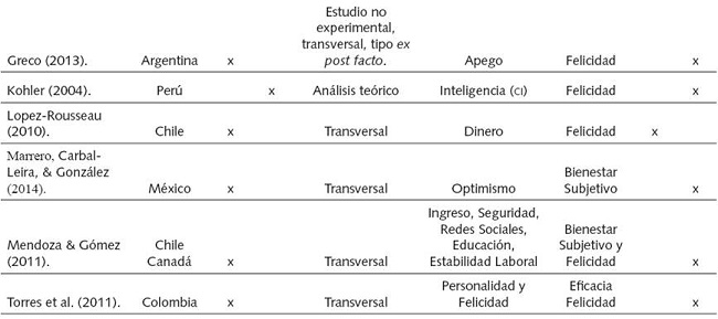 No obstante, en los últimos años se han adelantado investigaciones y se han publicado diversos artículos sobre temas relacionados con esta área. En una revisión de artículos publicados sobre el tema de la felicidad en varias revistas latinoamericanas, se encontró que en los últimos 10 años la mayoría de los trabajos ubicados bajo el término ‘felicidad’ se centran en variables relacionadas con el bienestar subjetivo y la calidad de vida (ver Apéndice).