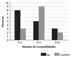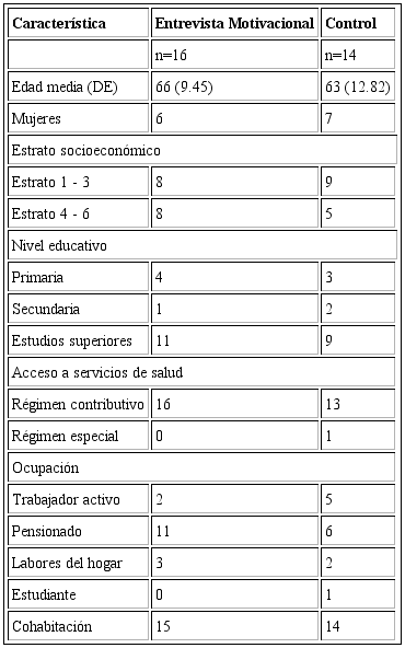 La información sociodemográfica se obtuvo de la historia clínica del paciente o en la entrevista directa con la psicóloga y fue registrada en un formato construido para el estudio. El tiempo de ejecución de la investigación fue de 5 meses. De un total de 30 participantes, fueron aleatorizados 16 al grupo intervención (EM) y 14 al grupo con trol. La edad promedio para el grupo de EM fue de 66 años (05=9.4) y para el grupo control de 63 años (ü£=12.8). En la distribución por género, se observó un mayor número de hombres en el grupo intervención (n=10) comparado con el de control. Una distribución equivalente se observó en el grupo control con respecto al número de participantes hombres y mujeres (n=7). Ambos grupos muestran un nivel similar en cuanto a educación, ocupación (pensionados) y estaban afiliados en su mayoría al régimen contributivo de servicios de salud (véase Tabla 1).