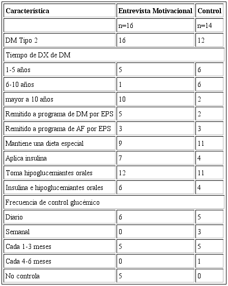 Respecto a las características de la línea de base relacionadas con la enfermedad, la mayoría de pacientes había sido diagnosticada con DM2 (intervenidos 16 y control 12), y los restantes, con DM1. La antigüedad del diagnóstico en los pacientes del grupo intervenido fue mayor a 10 años y menor a 10 años en el grupo control. Los pacientes que reportaron haber sido remitidos a un grupo de AF en algún momento de la historia de su enfermedad por su respectiva empresa prestadora de salud (EPS) fueron 3 del grupo intervenido (18.7%) y 3 del grupo control (21.4%; véase Tabla 2).