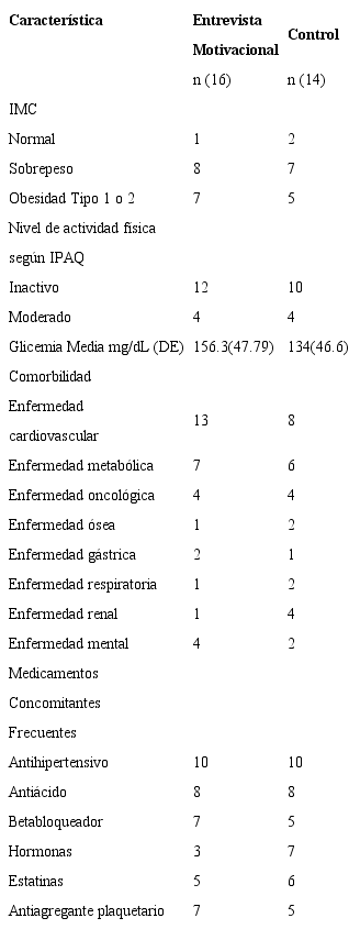 De acuerdo con la clasificación categórica del iPAQ-corto basal, 12 (75%) participantes del grupo intervenido y 10 (71.4%) del grupo control eran inactivos en el momento de la participación en el estudio y el resto fue evaluado como activo mode rado (4 participantes de cada grupo). La mayoría de los pacientes fue evaluada con sobrepeso o con obesidad tipo 1 o 2, acorde con la evaluación del índice de masa corporal (IMC) basal, y presentaba niveles de glicemia superior a 130 mg/dL. Entre las comorbilidades más frecuentes se encontró la enfermedad cardiovascular (intervenido 13 frente a control 8), y entre los medicamentos concomi tantes más utilizados están los antihipertensivos (véase Tabla 3). Esto indica que los pacientes con DM incluidos en el estudio presentan alto riesgo para algún evento isquémico, dada la prevalencia de enfermedad cardiovascular e hipertensión.