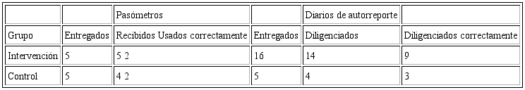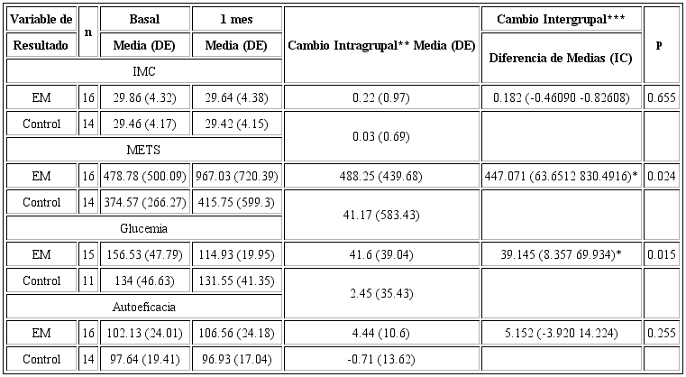 Factibilidad y aceptabilidad de las medicio nes y los instrumentos. Se realizó la evaluación completa basal y a los 30 días de seguimiento de todas las mediciones incluidas en la evaluación de la adherencia, excepto en el reporte de glicemia (basal y a los 30 días reportada por 15 pacientes en el grupo intervenido y en 11 del grupo control). Un participante reportó haber tenido en ese mes una consulta médica relacionada con su enfermedad.