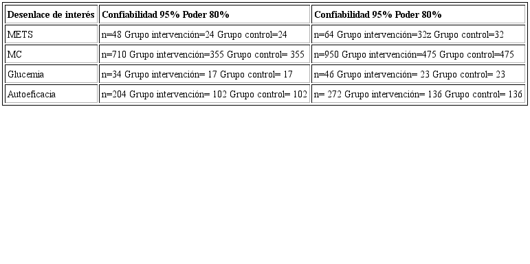 Con el fin de establecer el cálculo de la muestra para la realización de un ensayo clínico similar a mayor escala, se realizaron los cálculos teniendo en cuenta los resultados de este estudio para cada una de las variables (véase Tabla 6). Con el fin de identificar un tamaño de muestra capaz de detectar diferencias para todas las variables, tuvimos en cuenta la media del cambio intragrupal, obteni do en el grupo intervenido para cada una de las variables y la media del cambio intragrupal del grupo control. Para el cálculo se tuvo en cuenta el criterio de diferencia de medias y una aleatorización 1:1, una confiabilidad del 95% y cálculos de muestra para un poder estadístico del 80% y del 90%. Se ajustó a un porcentaje de pérdidas del 15% teniendo en cuenta que en el ensayo a gran escala puede aumentar el número de sesiones de EM en el grupo de intervención. Al considerar los parámetros mencionados, calculamos que la muestra de un estudio a gran escala, con el fin de identificar diferencias en todas las variables, requerirá una muestra total de 950 participantes (475 participantes por grupo). Sin embargo, en la Tabla 6 se describe el cálculo de la muestra (para un poder del 80% o del 90%) teniendo en cuenta el cambio solo en METS, glucemia o autoeficacia.