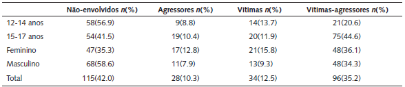 De forma semelhante ao reportado na literatura, o índice de vitimização foi superior ao de agressão. Entretanto, destaca-se o percentual elevado de vítimas-agressores (35% do total da amostra), bastante superior aos índices em torno de 5% encontrados em algumas pesquisas (Jung et al., 2014; Kowalsky & Limber, 2013). Esse dado é relevante para desenvolver estratégias preventivas e protetivas aos adolescentes que compõem esse grupo, tendo em vista que vítimas-agressores podem apresentar mais dificuldades em receber apoio social dos que os jovens que foram apenas vítimas (Kristensen & Smith, 2003).
