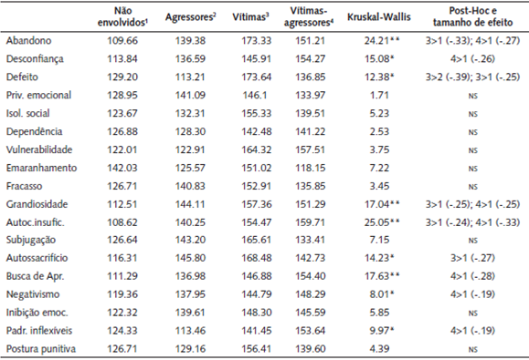 Análises post-hoc foram realizadas para comparação entre os quatro grupos de participantes: vítimas, vítimas-agressores, agressores e não-envolvidos. As vítimas e vítimas-agressores indicaram maior severidade do que não-envolvidos nos esquemas Abandono, Grandiosidade e Autocontrole Insuficiente. Vítimas também indicaram escores significativamente mais altos do que não-envolvidos no esquema de Autossacrifício e Defeito, assim como maiores escores que agressores no squema de Defeito. Vítimas-agressores apresentaram escores de EIDS significativamente mais altos do que não-envolvidos nos esquemas de Desconfiança, Busca de Aprovação, Negativismo e Padrões Inflexíveis.