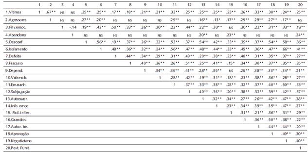 Questionário de Esquemas para Adolescentes de Young - QEA (Santos et al., 2009). Trata-se de um instrumento de autorresposta, destinado a adolescentes entre 12 e 18 anos. É composto por 54 itens, relacionados a esquemas iniciais desa-daptativos propostos teoricamente por Young et al. (2003) na Terapia Focada em Esquemas. Para cada esquema são apresentadas de duas a quatros afirmativas, dispostas de forma aleatória. Cada uma delas deve ser graduada em uma escala Likert de 6 pontos, que varia de 1 (não tem nada a ver com o que acontece ou aconteceu comigo) a 6 (é exatamente o que acontece ou aconteceu comigo). Essa escala é uma adaptação do Young Schema Questionnaire-YSQ3, originalmente destinado à avaliação de esquemas em população adulta. Foi adaptada e validada por Santos et al. (2009) em adolescentes portugueses, apresentando alfa de consistência interna geral de .93. Tendo em vista que ainda não há uma versão com evidências de validade em população brasileira, a escala foi submetida à adaptação cultural e semântica para o idioma português do Brasil, a fim de se obter equivalência gramatical e de vocabulário (Pedroso, Oliveira, Araujo, & Moraes, 2004). Nessa versão, os coeficientes alfa variaram de .46 (para o esquema de Dependência) a .82 (para o esquema de Fracasso). Alguns coeficientes abaixo de .70 podem ser explicados pelo fato de que cada subescala possuía em torno de três itens, o que, segundo Cronbach (1951), pode contribuir para valores de alfa mais baixos.