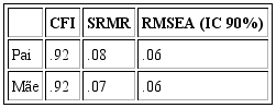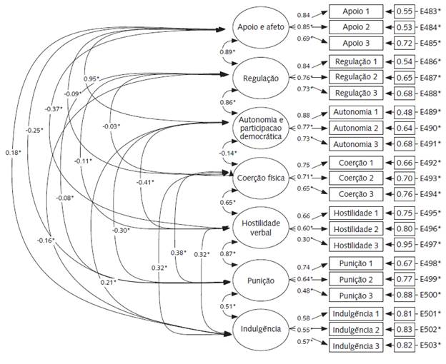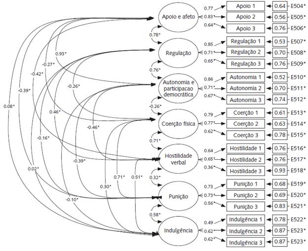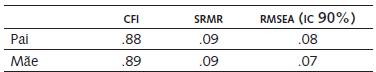 Numa primeira fase, foram realizadas AFC para o instrumento na sua versão original, que contemplava todas as dimensões propostas pelos autores (apoio e afeto, regulação, cedência de autonomia e participação democrtática, coerção física, hostilidade verbal, punição e indulgência), constatando-se que os índices de ajustamento não se encontravam de acordo com os valores teoricamente esperados (acima de .90 para cfi e valores abaixo de .08 para os índices SRMR e RMSEA e Ratio inferior a 5.0; MacCallum et al., 2001; Schuma-cker & Lomax, 2004) (CFI=.88/.89, SRMR=.09/.09, RMSEA=.08/.07, χ2(168)=732.11, p=.001, Ratio=4.36 / X2(168)=699.01, p=.001, Ratio=4.16) para o pai e para a mãe respetivamente (Tabela 2).