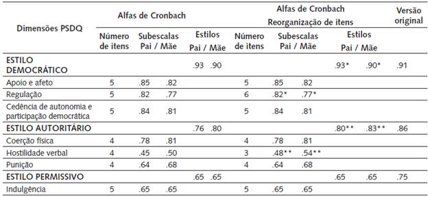 De modo a analisar a consistência interna do instrumento -tal como este foi proposto originalmente pelos autores-, tanto na sua totalidade como em cada dimensão, foram calculados os coeficientes alfa de Cronbach. Estes valores permitem avaliar a homogeneidade da variância entre os itens, sendo que valores superiores a .70 são considerados ajustados (Cronbach, 1951). A análise de consistência interna, na amostra em estudo, demonstrou valores de alfa de Cronbach de .86/.81 para a totalidade do instrumento na sua versão para o pai e para a mãe, respetivamente. Os valores de alfa de Cronbach relativamente às dimensões foram de .85/.82 para o apoio e afeto, .82/.77 para a regulação, de .84/.81 para a cedência de autonomia e participação democrática, de .78/.81 para a coerção física, de .45/.50 para a hostilidade verbal, de .64/.68 para a punição e de .65/.55 para a indulgência na sua versão para o pai e a mãe respetivamente (Tabela 1).