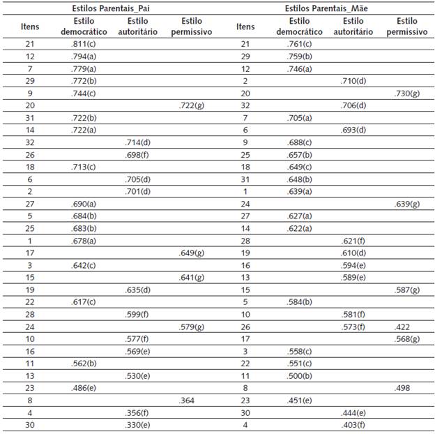 Os requisitos básicos para a realização da afe foram, também, garantidos na versão da mãe mediante a análise dos valores obtidos no Teste Kaiser-Meyer-Olkin (KM0=.90) e no Teste de Barlett (7298.84, p=.001). Esta análise em componentes principais explicou 43.78% da variância total. A rotação varimax, em três componentes, permitiu verificar que, na versão da mãe, também, o item 23 satura num fator distinto do originalmente proposto pelos autores (Tabela 3).