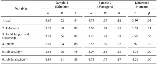 Descriptive statistics and reliabilities for each of the variables measured in both samples are reported in Table 1. As can be seen, many of the scale means were significantly different across the two samples. Overall, CSES were higher and job satisfaction was lower in the manager data set (CSES=3.79, job satisfaction=3.73) than in the scholar data set (CSES=3.65, job satisfaction=3.99). Moreover, scholars seemed to experience lower job security (M=2.68) than managers («=3.07). That the dispositions, job satisfaction, and perceptions of job characteristics were significantly different across the two samples argued against combining them for the analysis. Therefore, we decided to analyze both samples separately.