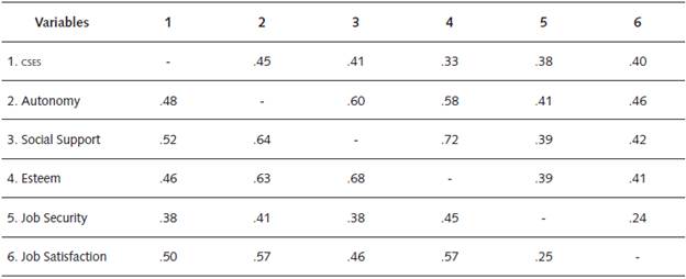 We conducted descriptive and correlational analyses as a preliminary step. The internal consistency of each scale was also calculated (Cronbachs alpha). To test our hypotheses, we conducted structural equation modeling analyses with latent and observed variables in IBM amos (version 22), using a maximum-likelihood estimation method. The hypothesized model included one exogenous latent variable (i.e., CSES) and two endogenous latent variables (i.e., perceived job characteristics and job satisfaction). Regarding model specification, we followed Bagozzi & Edwards (1998)' recommendation to use partial disaggregation models. Therefore, instead of including all 12 items of the CSES as indicators of the latent CSE construct, we formed two parcels by combining the first six and the last six items of the scale. The same strategy was used for the job satisfaction latent factor. The indicators of the perceived job characteristic latent factor were the average scores of autonomy, social support from colleagues and leaders, esteem, and job security. We followed Byrne (2001)'s recommendation to use and compare several fit statistics, such as: Chi-square (x2), Root Mean Square Error of Approximation (RMSEA), Comparative Fit Index (cif), Goodness of Fit Index (GFI), and Tucker-Lewis Index (TLI). As suggested by Byrne (2001), CIF , GFI , and TLI values above .90 and RMSEA values as high as .08 indicate a satisfactory fit.