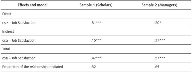 H-2 stated that the relationship between CSES and job satisfaction would be mediated by perceived job characteristics. Table 3 presents the direct, indirect, and total effects of CSES on job satisfaction for both samples. To further examine the significance of these effects, we created 1,000 bootstrap samples using the Montecarlo method in amos (version 22). As the table shows, the total effects of CSES on job satisfaction were relatively strong across samples, although the direct relationship was found to be stronger in Sample 1 than in Sample 2. Results also indicated a significant indirect relationship between CSES and job satisfaction across the two samples. These results provided support to H-2, thus showing that most of the significant relationship between CSES and job satisfaction was partly mediated by perceived job characteristics.